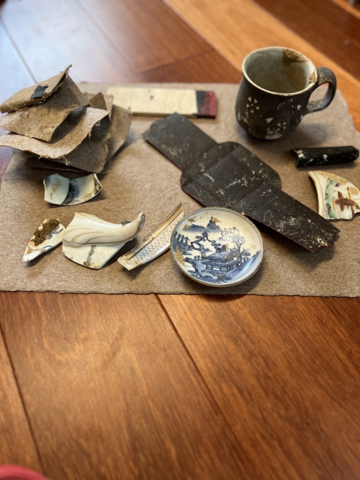 希望の場所であったパオ3棟共に土砂や岩に押し流されてしまいました。ここには、仕事の道具や朝市の自宅から救い出せた品々が置いて有りましたが全て流されてしまいました。悔しさと自然の猛威には太刀打ち出来無い怖さを体感致しました。心も折れました。本日、この現場に居るお地蔵さんのお顔見に行って参りました。お顔は優しく微笑んでるようで、ふと下を見ると見覚えのある丸い物が主人の大切にしていた品。そして直ぐ側には制作の為の(和紙)コースターやランチョンマットが数点落ちていました。お地蔵さんには、もう少し仕事頑張ってみたらと言われた気が致しました。