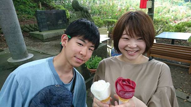 温泉街全体に活気があった頃には、6月-10月のシーズン中に約1万人の入場者があったとされますが、現在は半数程度に落ち込んでいます。一昨年から、まちづくりチームYUKAIがばら園の管理を引き受けることになりました「ばら園にかつての賑わいを取り戻したい」と考えた結果、薔薇型アイス「アイスの薔薇」をメイン商品とした販売所「ローズガーデンカフェ」を、昨年から簡易的にオープンいたしました。