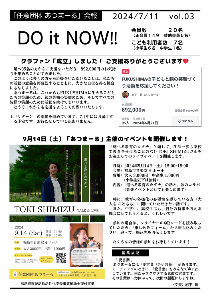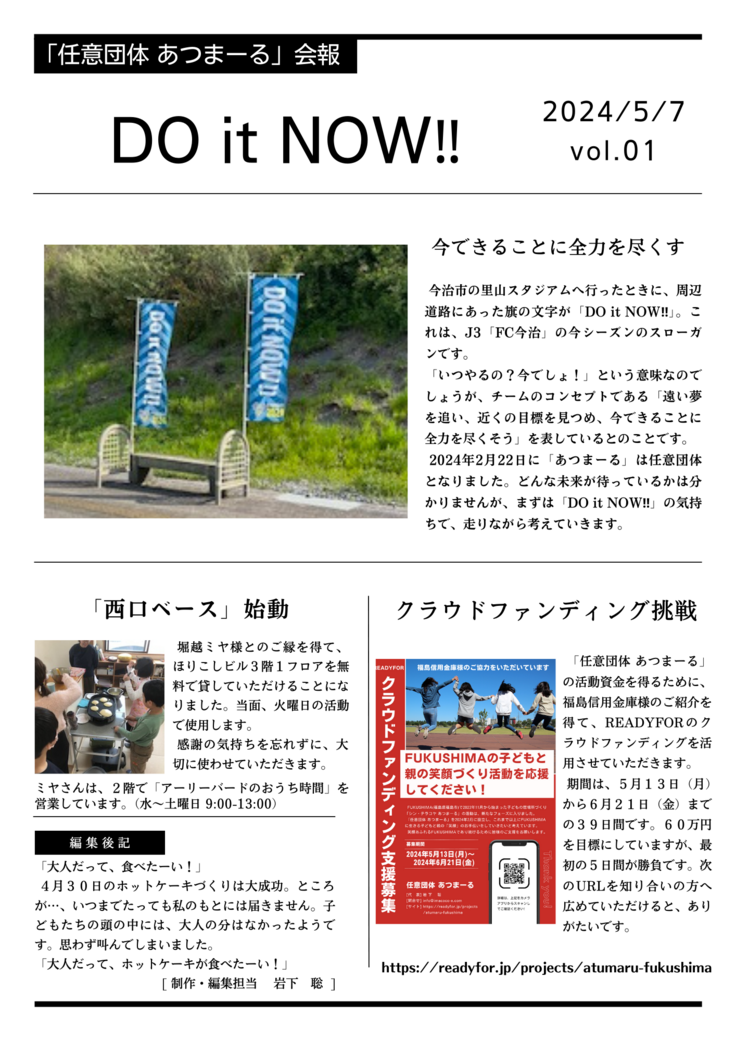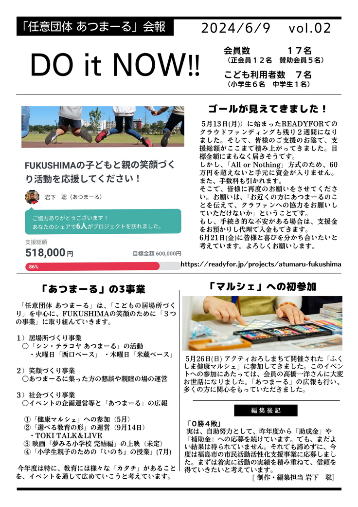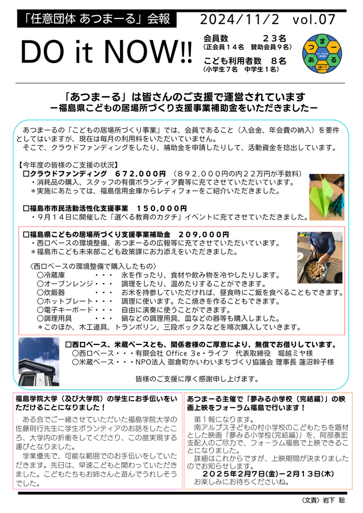 さらには、「あつまーる」がFUKUSHIMAの皆様の笑顔をお手伝いする存在となれるよう、次年度も支えていただければ、大変うれしく思います。