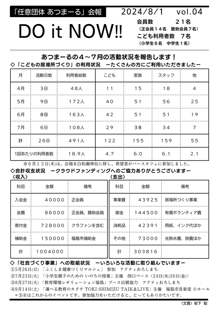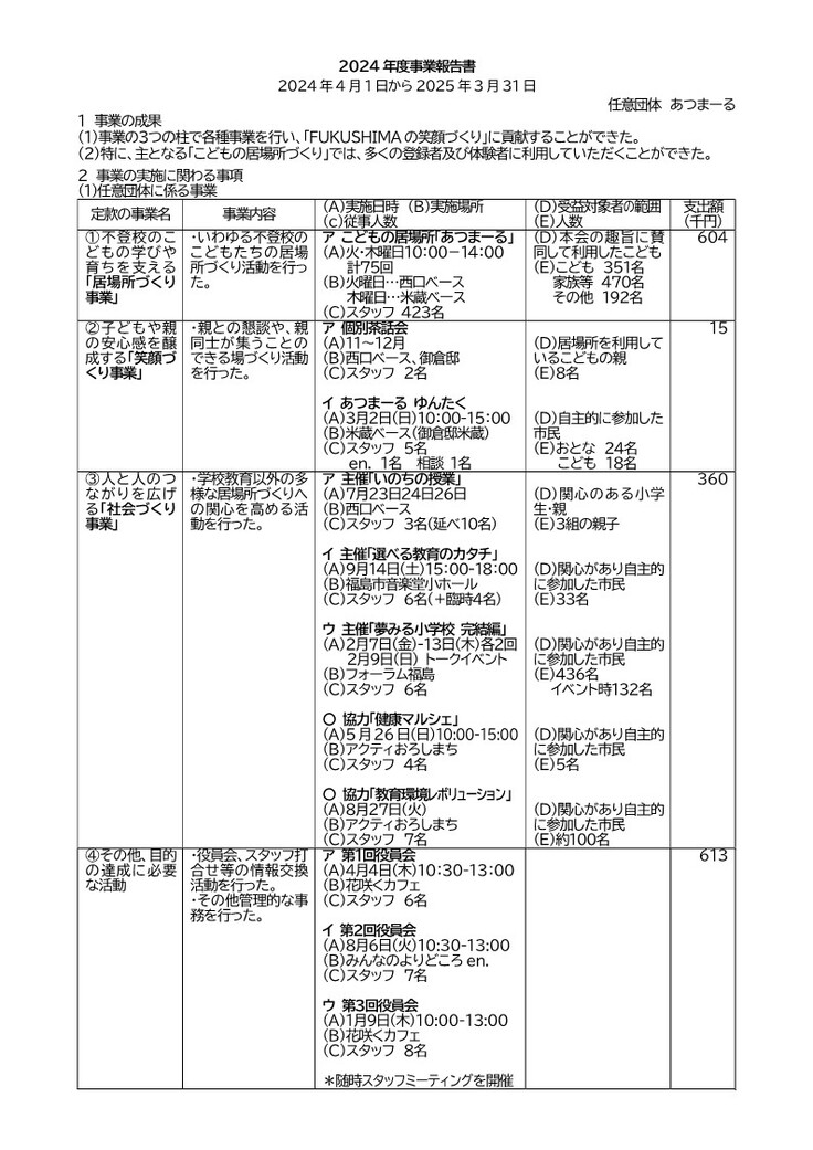なお、総会前ではありますが、「事業報告書」と「活動決算書」を掲載しますので、参考としてご覧ください。