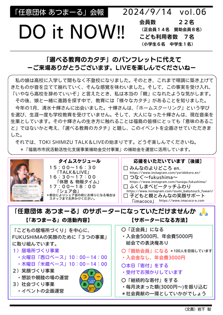 生涯一度も学校教育を受けたことのない清水十輝さんを福島にお呼びして、TALK&LIVEを開催しました。「あつまーる」は「多様な学びの場の必要性」についても発信しています。