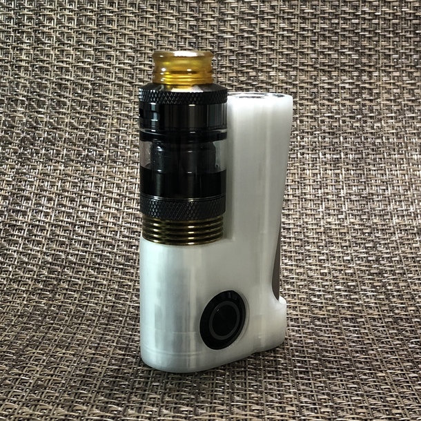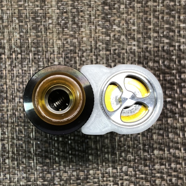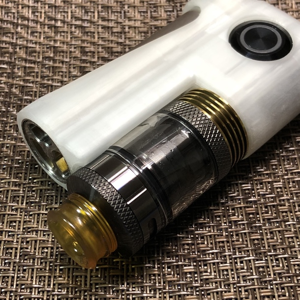 このアトマイザーはそのまま装着すると天辺から凹みますので、写真のように24mmのヒートシンク(高さ7.7mm)とあわせて載せてみました。どうでしょう?カッコよくないですか? このアトマイザーも公称25mm径なので、並のSTEALTHでは使う事ができませんが、本件では使用する事ができますので一家に一台のMODだと言う事がわかるかと思います(強引)。 故にこのMODはアトマとの親和性は世界最高峰という事なのです!(aumods調べ)