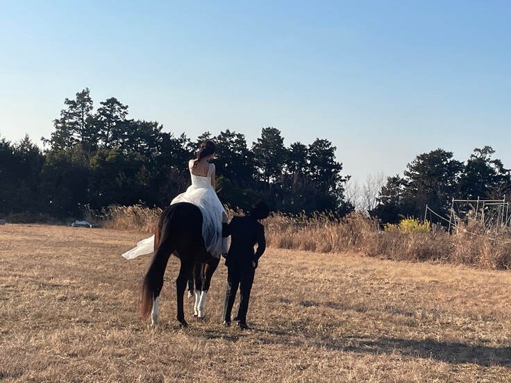 結婚の記念に、馬に乗って記念撮影をしていただけます。提携先のカメラマンを御紹介させていただき、ウエディングドレス・タキシード姿で一生の思い出を、馬とともに写真に残せますよ。