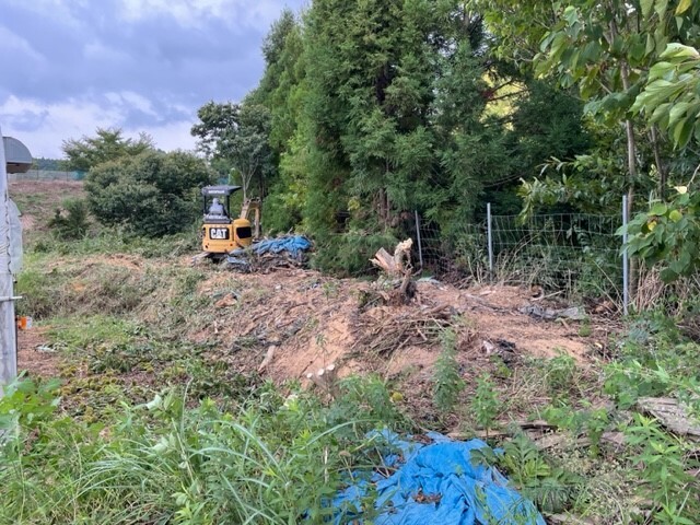 ②傾斜の土地を水平に整地し、新規で購入した放牧柵を打ち込んでいきます。