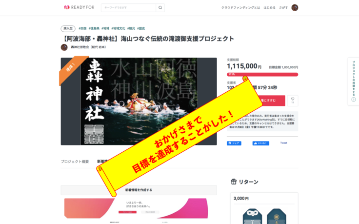 令和元年例大祭まで残された時間が非常に少ない中で大慌てで作った今回のプロジェクト。東京2020大会エンブレムデザイナー・野老さんの『轟紋様』奉納に始まり、スーパーカメラマン・健太郎くん、スーパークリエイター・佐竹くん、海陽町が誇る名カメラマン・戎谷さん、徳島新聞社様などなど多くのプロフェッショナルな方々のご協力のおかげで、短い準備期間であったにも関わらずびっくりするほどクオリティの高いプロジェクトページとリターン品ライナップとなりました。