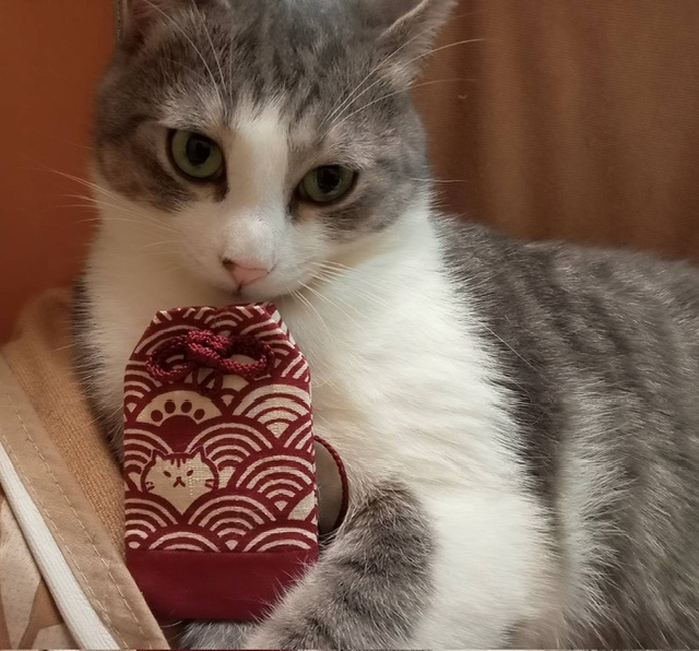 (写真は、猫のヒゲ入れお守りを持つ、あわねこ卒園生のふんちゃん)