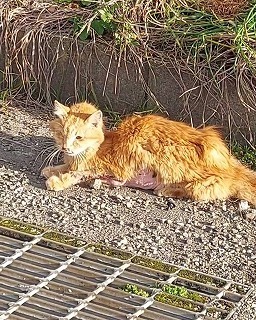 TNR&広報のN田さんが通勤途中で倒れている虎丸を発見。それはそれは酷い状態で毛は抜け落ち、皮膚はズル剥け。保護してすぐに病院へ走り入院治療開始。