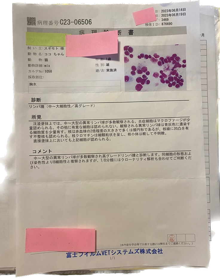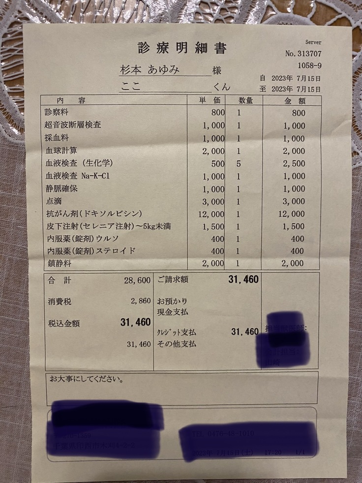 獣医師には、プロトコルを作っていただいております。7/22に、抗がん剤治療の1サイクルを終了したところです。