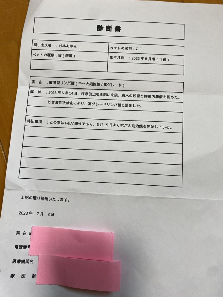 今後は、慢性腎不全の治療を続けながら、リンパ腫の再燃に対応した検査や治療をしていくことになります。診断書は、下の通りです。