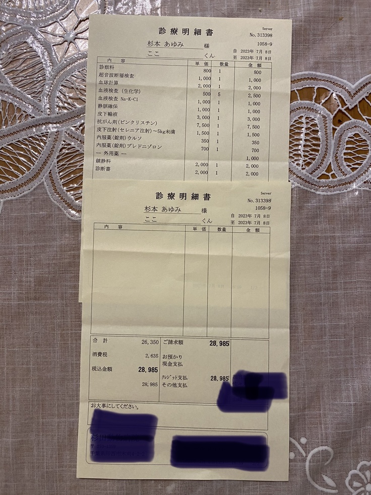 獣医師に治療費を相談したところ、順調に治療が進むかどうかで治療費や検査などは変わってくるということでしたが、1年間生存を想定して、概算した費用との説明がありました。