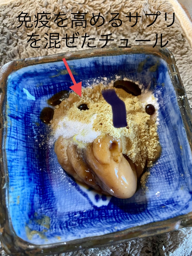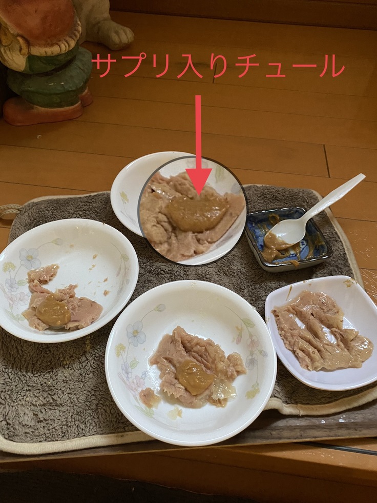 ぶん太ちゃんは、上に乗せると、チュールも食べなくなるので、指で口に入れています。サプリは、常に体の中にあることが重要だそうです!