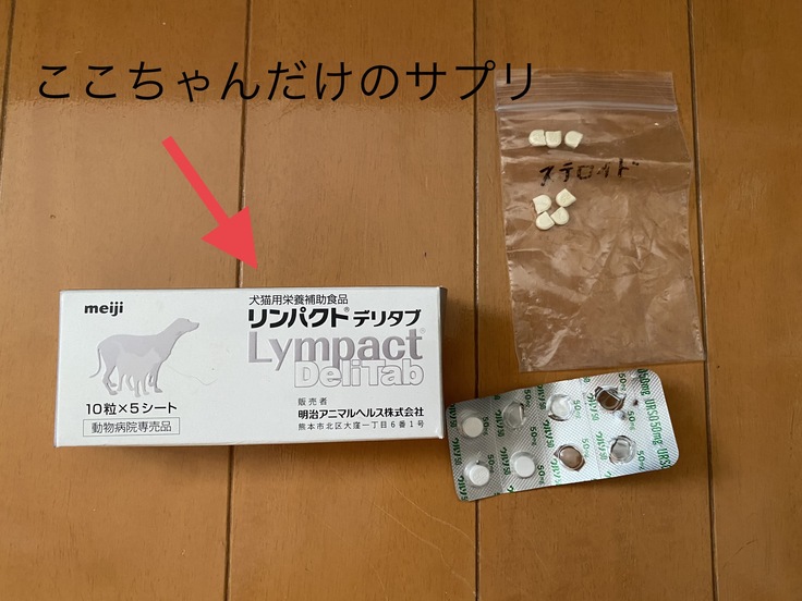 昨年、白血病陽性がわかってから、発症しなかった前例はないか調べまくり、免疫を上げるしかない!ことがわかり、効果があるとされているサプリを与えています。一つが、コルディ、そして、Dフラクションプロ(アメリカ直送)、マルチビタミン。そして、ここちゃんだけに、リンパクトデリタブ(本当は全員にあげたいところですが節約、、、)それを、総合栄養食ちゅーるに混ぜて、ウェットに乗せて、朝夕あげています。