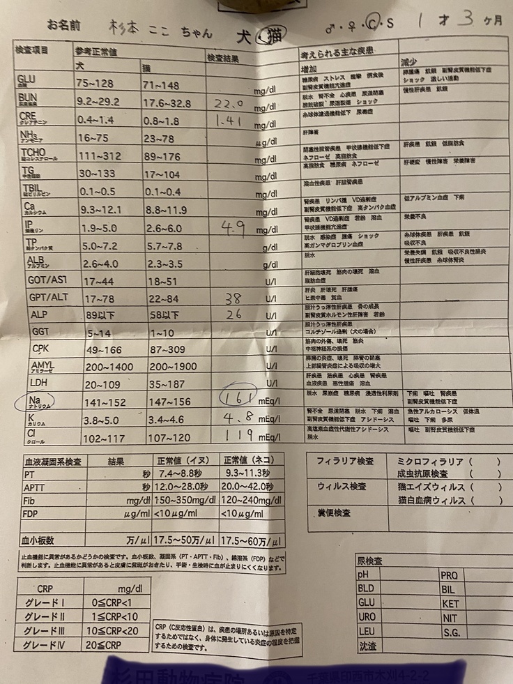 今日は、ここちゃんの抗がん剤治療の日。シクロホスファミドを投与します。血液検査の結果は良好。ナトリウムの値が、少しずつ上がっているのが気になるということでした。このまま、モニターしていき、上がるようなら、点滴の種類などを考えていくということでした。他は、全く問題がないので治療できるということで、午前中に預け、夕方迎えに行きます。今回も副作用が出ないといいなと願います。