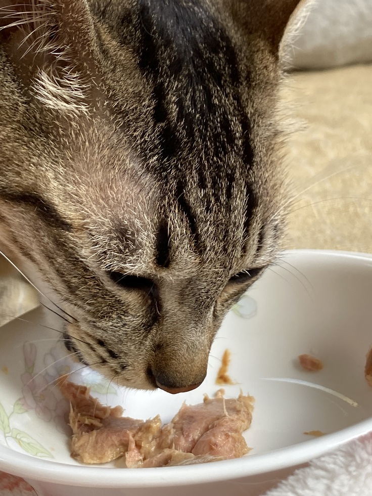 夕飯は、お皿では食べず、お皿の前に少し出したら、少しだけ、時間をかけて食べてやめてしまいました。他の餌をあげたら、お!って感じで食べ始めたので、いいぞ!と思っていたら、これもちょっとでやめてしまいました🥲