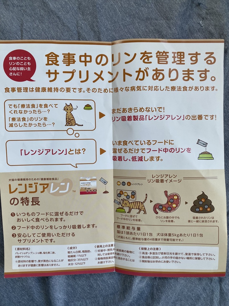 今日からリンを吸着してうんちで出すサプリ「レンジアレン」を飲み始めました。やはり、とても嫌がったそうです。ウルソ(肝臓の薬)や、ステロイドも、病院で飲ませていただくことにしました。家は、ストレスフリーの、安心できるところにします。
