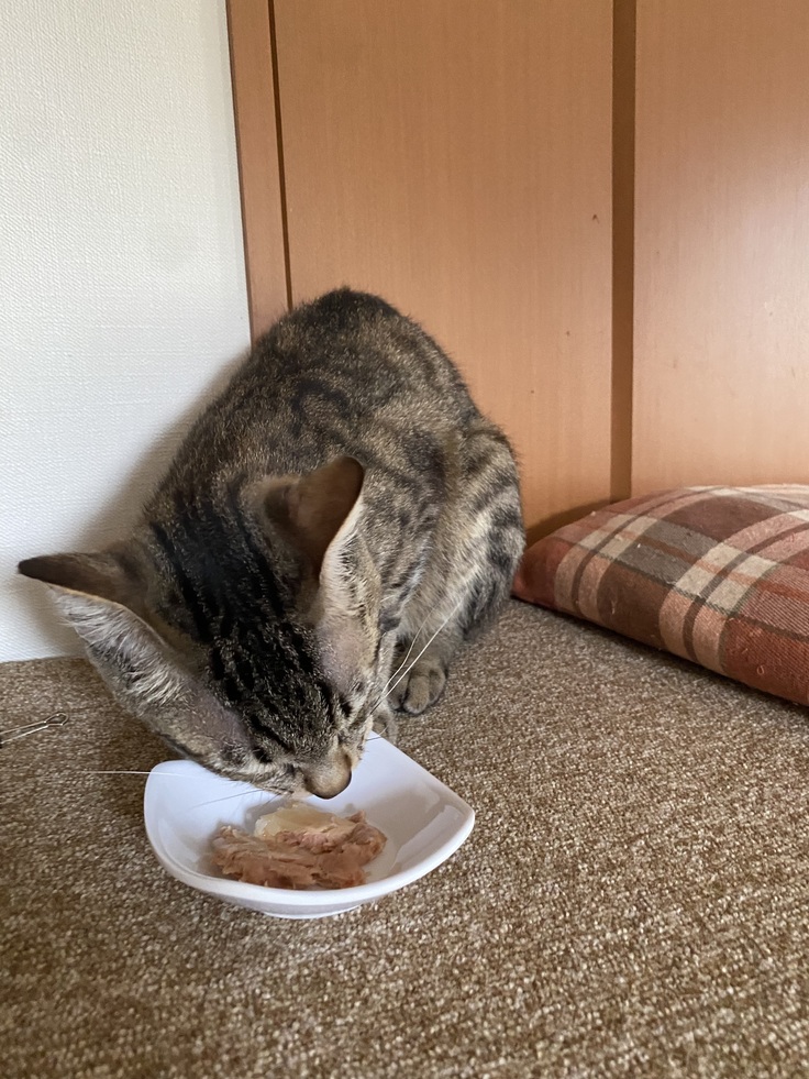 朝ごはんは、焼きがつおのほたて味フレークをあげてみました。食べました!一生懸命に、時間をかけて食べていました。でも、量としては、ミルクたちの大口2、3口というところです。それでも、昨夜の状態からは大進歩です。その後は、ケージにこもらず、窓際などで穏やかに寝ていました。