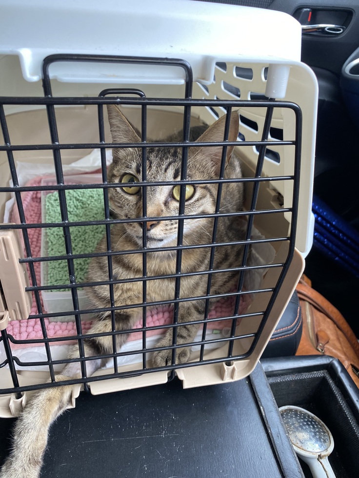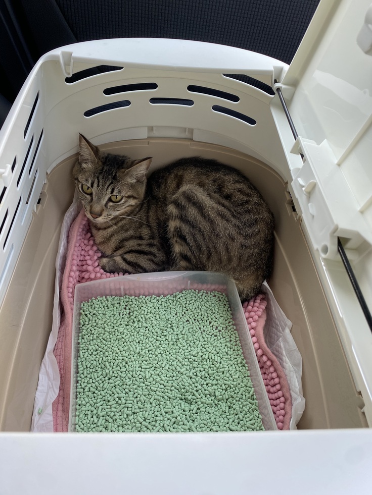 病院に出発する時のここちゃん。毎回、おしっこをしてしまうので、砂を入れました。小さい頃は