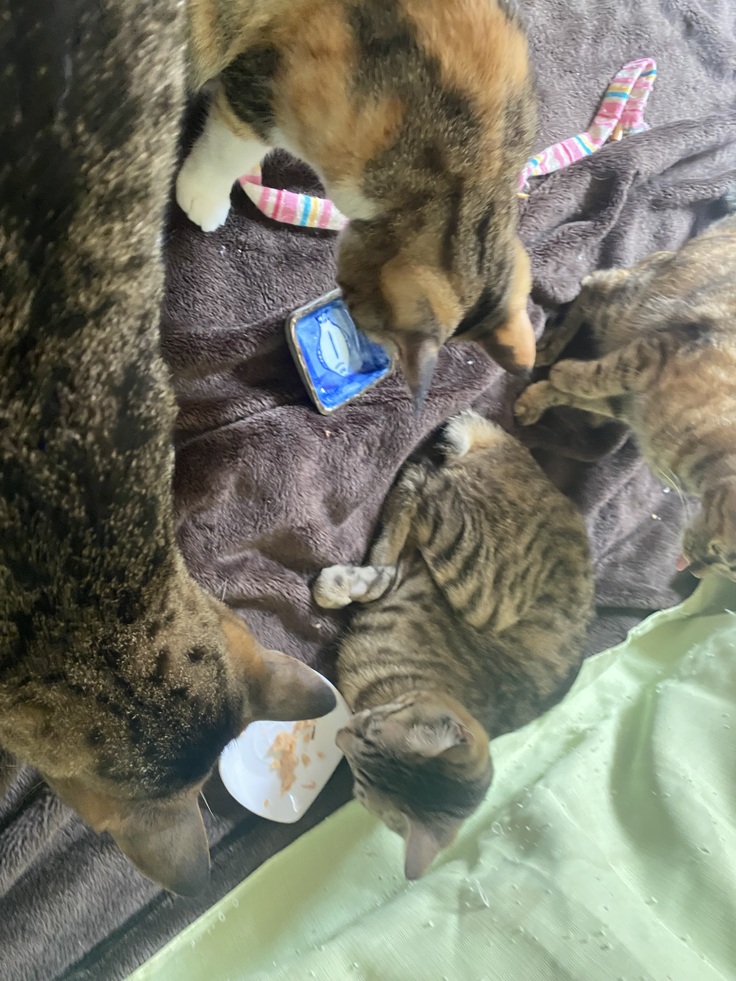 ここちゃんが、ごちそうさまになったら、戻します。そしたら群がるわけですが、そこで、ここちゃんも、つられて少し食べます。