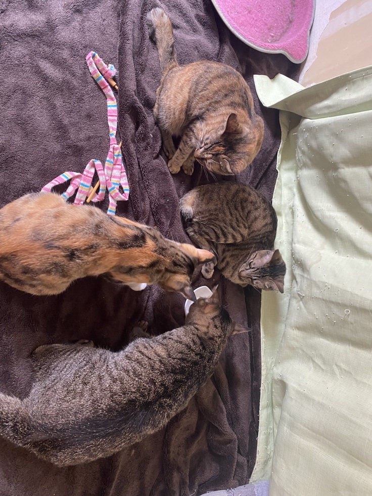 夕ごはんは、兄弟と同じように扉の前のケージの上で待ちます。量は少なくてもちゃんと、食べてくれます。ウルソも、リンパクトデリタブ も、がんばって飲み込んでくれました。コルディとDフラクションプロとビタミンを混ぜたチュールも何とか飲み込んでくれました。女子ふたりは、好きなのですが、男子ふたりはきらいなので、指で口の中に入れられるのです。