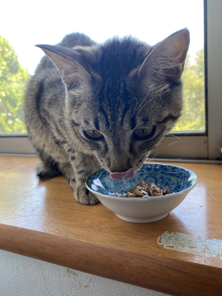朝ごはん、待ちきれない!っていう感じで、ごらんの通りもりもり食べました!レンジアレン入りのモンプチ。これは総合栄養食なので、食べてくれたら御の字です^_^もう一種類は、焼きがつお。一般食。カリカリは、まだチラ見してやめてしまいます。でも、水分をたくさん摂らなくてはいけないので、ウェットを食べてくれてよかったです。腎臓によいAIMのカリカリを食べてくれたら最高なのですが。まぁ、焦らずに、食べたことを褒めまくります。昼も、ここちゃんだけ、こっそりモンプチをあげました。夕ごはん分の中から少しレンジアレンを混ぜて。寝ぼけた感じでそんなに量は食べませんでしたが、レンジアレンが混ざった汁は飲んでくれたのでよかったです。