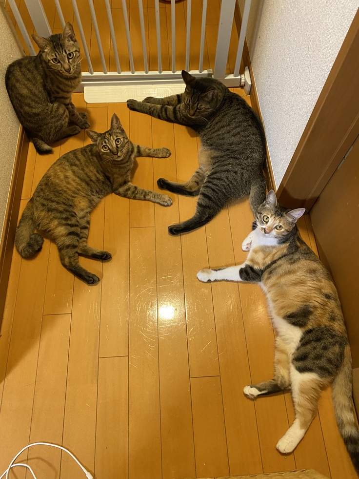 夕食後、ねこ部屋の扉の外でくつろぐ兄弟。他のねこ5匹と接触させられないので、この柵から先には行けません。顔見知りにはなっています。切ないです。