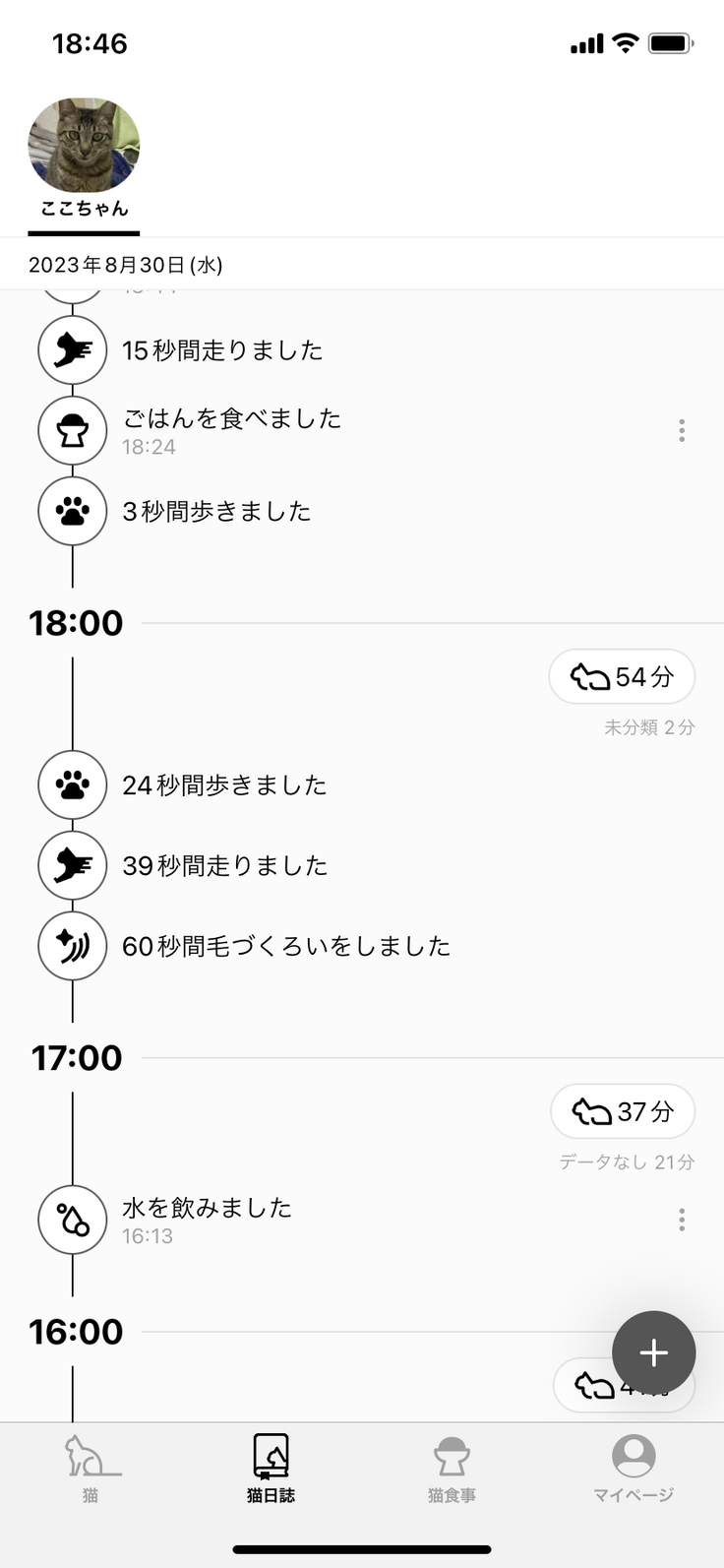 今日、キャットログが届いたので設定を完了して使い始めました。キャットログは、WiFiとデバイスを繋げて、首輪からわかるここちゃんの行動を一部始終を記録してくれるものです。スマホアプリです。何時に水を飲んだ。何時に何分歩いた。走った。餌を食べたなど、全てが記録されています。これでここちゃんの変化が分かり、安心です。