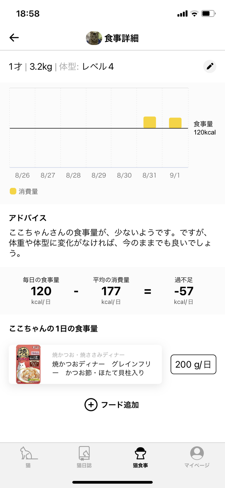 毎日、4から5袋食べていますが、キャットログの計算によると、4袋だと足りないということです。
