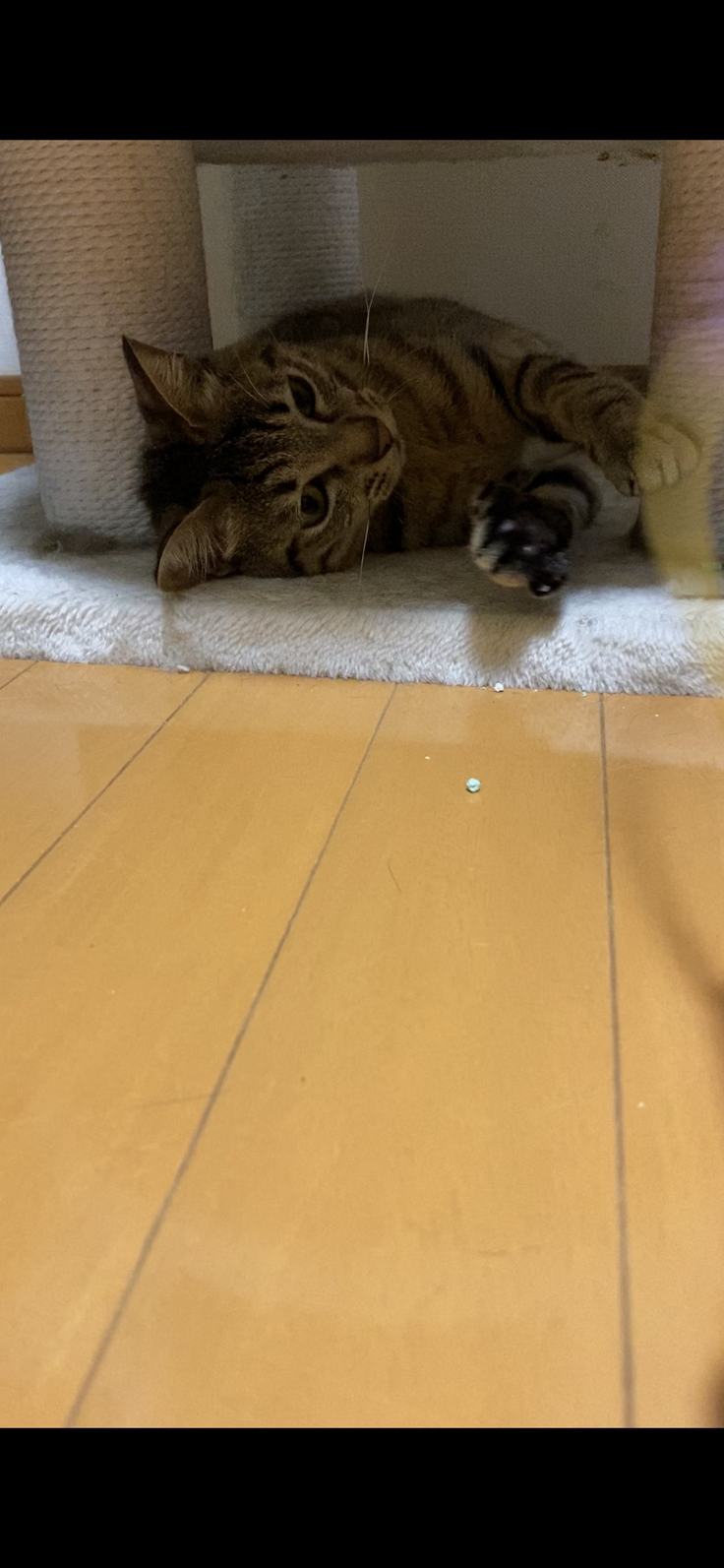羽系のおもちゃでは獣になるくらい夢中に奪いに来るのですが、以前からある紐のおもちゃは飽きたようでつれません。久しぶりにボンボンがついたおもちゃで遊んだのですが、カメラを向けるとやめてしまいました。食べる以外は寝てますね。早く元気に飛び回れるようになってほしいです。