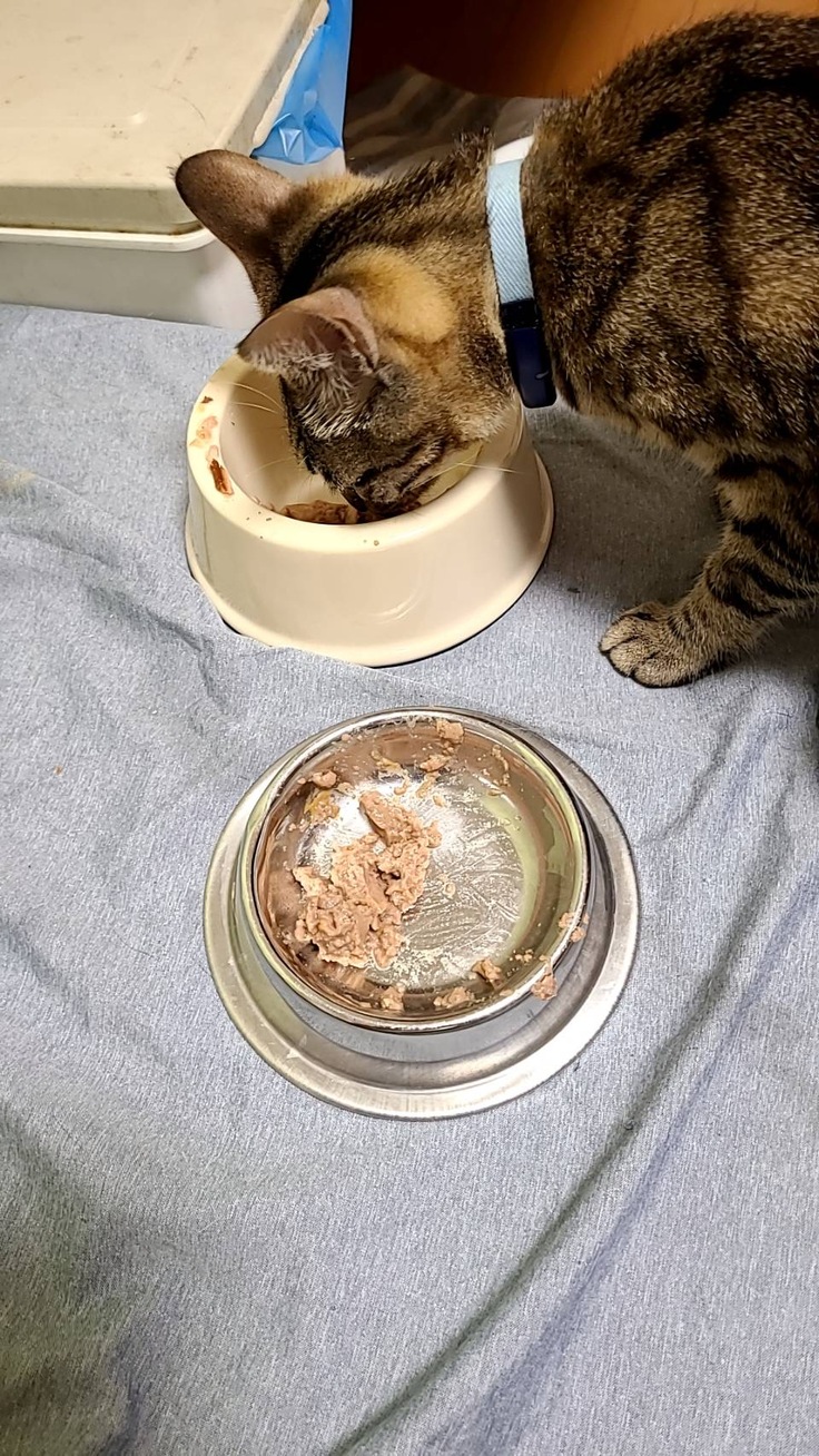 夕ごはんは、私が用事があったため、夫があげました。いつも通りたくさん食べたようです。帰ったら、サプリをあげて、体重を測り