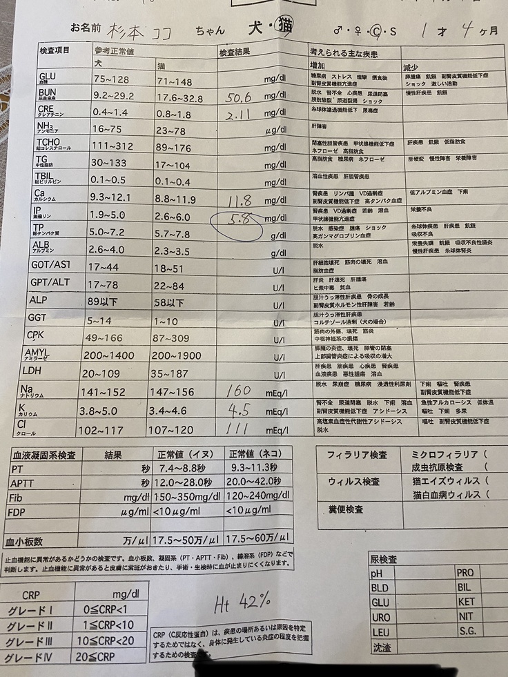 さて、血液検査の結果は、腎臓障害の程度がわかるBUNとクレアチニンの数値は変わりませんでしたが、腎臓障害を進めてしまうリンの数値が半分になり、基準値になりました!レンジアレンというリンを吸着させて排出するサプリの効果です。よかっです。今後、BUNとクレアチニンが下がってくれたらなお、嬉しいのですが。
