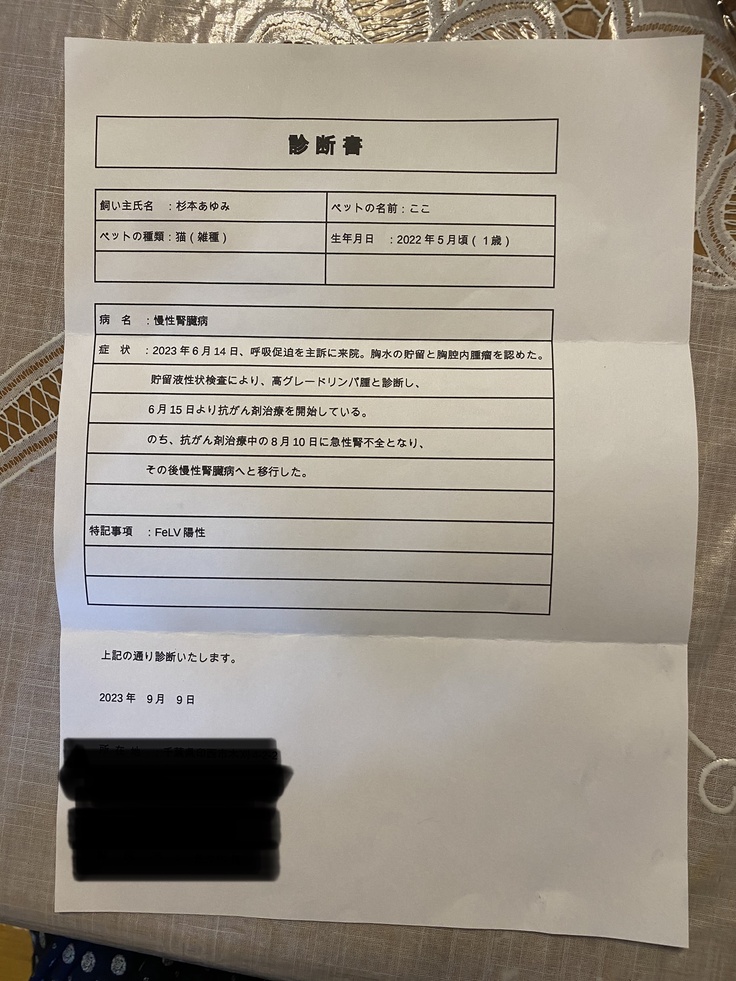 readyforに提出した診断書を添付します。慢性腎不全になってしまったので、治療方針が変わりました。