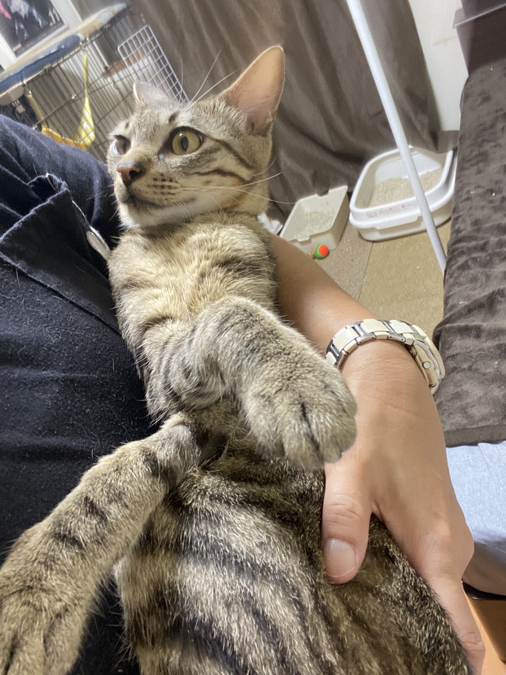薬を飲まされた後の抱っこで、少し警戒気味。ゴロゴロは言ってますが。