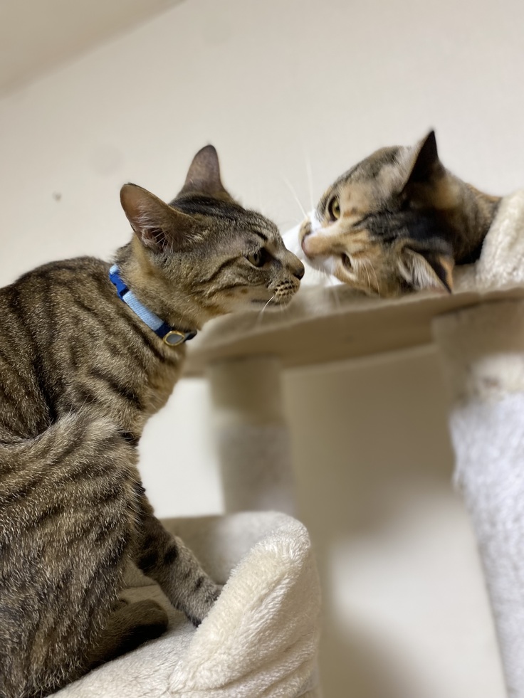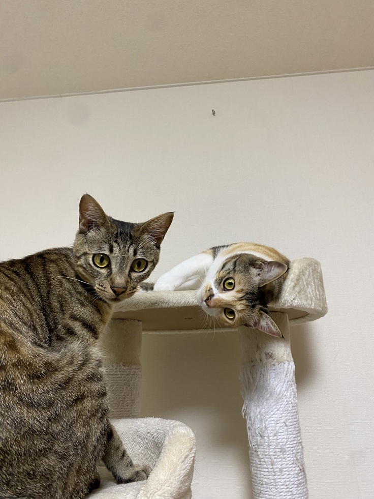 夕ごはん後、ミルクと仲良く、キャットタワーで遊んでいました。