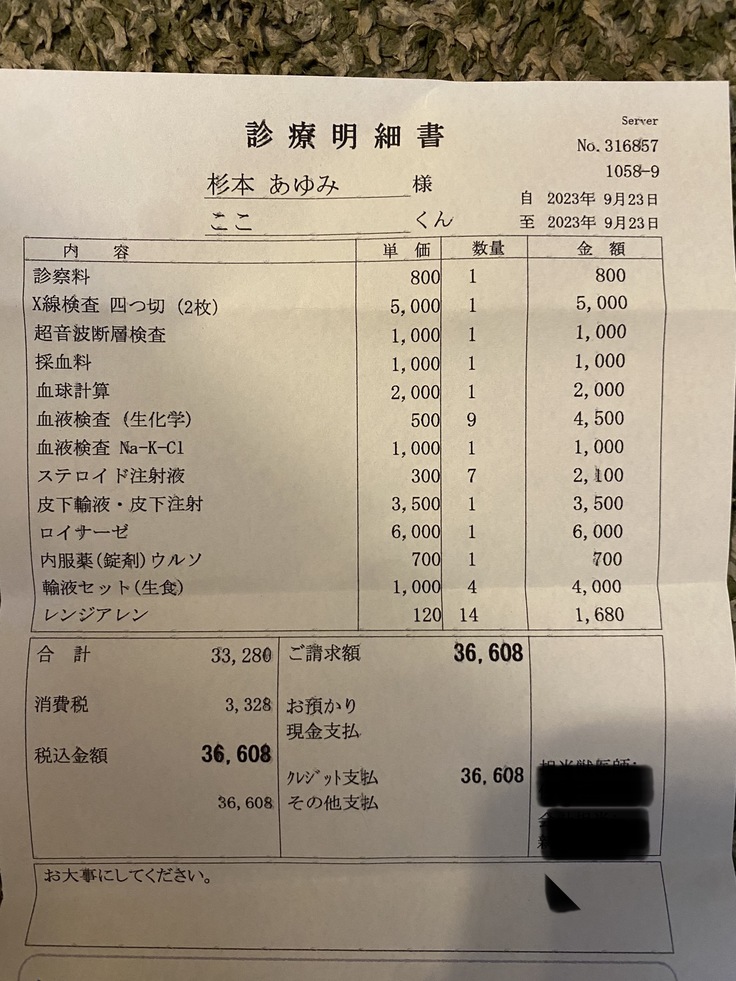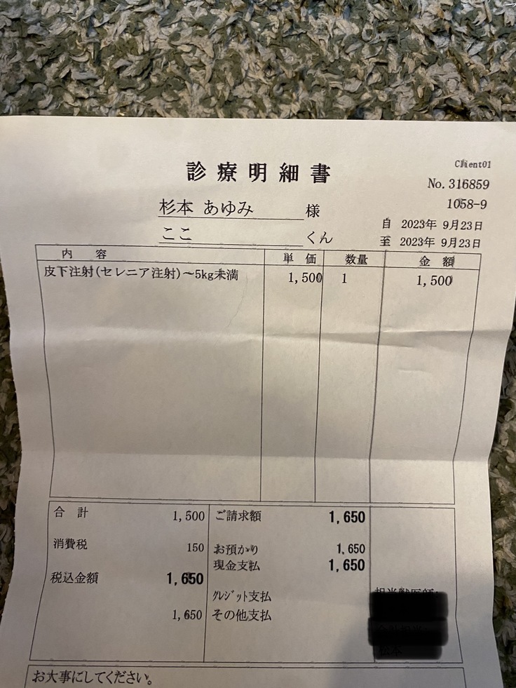今回の明細です。会計後、吐き気どめの注射をしたので2枚になります。