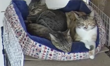 昼間は、兄弟と仲良くベッドで寝ているようです。見守りカメラ画像です。↓
