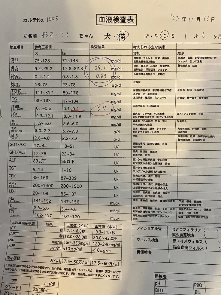 獣医師は、この段階になったら血液検査はしない予定だったとおっしゃっていましたが、最小限の血をとって、貧血、肝臓、腎臓についてだけ調べることにしました。