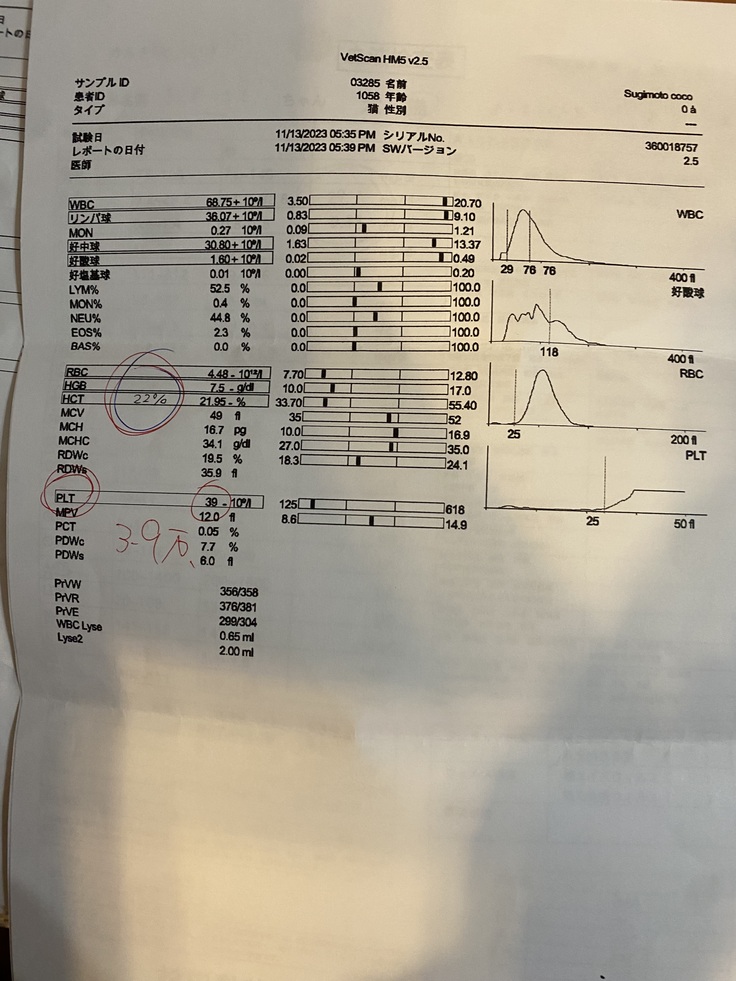 それから、胸水は、前回取りきれなかった分も入れて85mL。結構しんどかったはずだそうです。そして、血の色が濃くなっていました。腫瘍から出血しているということで止める術はないそうです。 血液検査の結果、やはり、貧血が一週間前から大きく進んでいました。そして、血小板数が大きく減っていました。血小板は、出血を止めるために使われているけど出血が止まらないから足りなくなっているか、もしくは、骨髄が腫瘍化し、血小板を作れなくなっているか。体の至る所に血栓ができるDICを起こしている可能性もあるとのことでした。