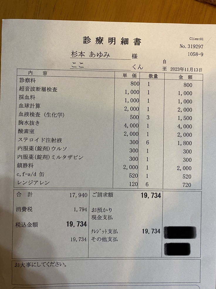 腎臓の値は,よくなっていましたが、これは食べていないからだということでした。ただ、胸水がたまらないようにするために、点滴をやめてもいいかもしれない、ただ、循環を考えたら,少量入れた方がいいかもしれない,とのことで、2日おきに、50から100mLを入れることにしました。