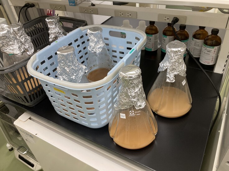 インキュベーターの中にたくさんの三角フラスコを入れて、