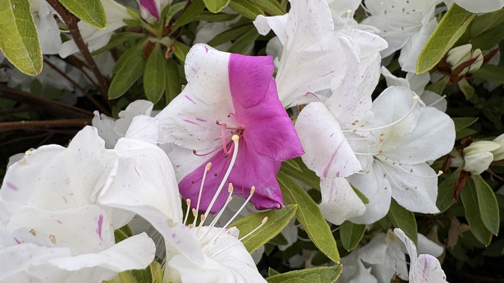 周辺の白い花の中にもピンク色が散っていて、不思議な雰囲気です。