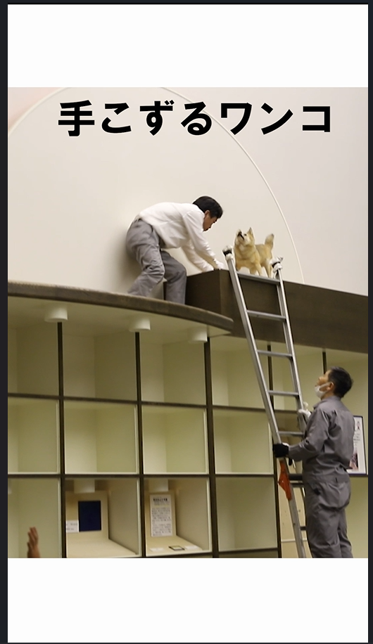 落下防止のため、脚の先の金属が展示台に固定されていたのですが、撤収の際その金具がなかなか取れず、その様子が展示台から降りるのを嫌がっているように見えたので動画にしたところ、たくさんの方にご覧いただきました。