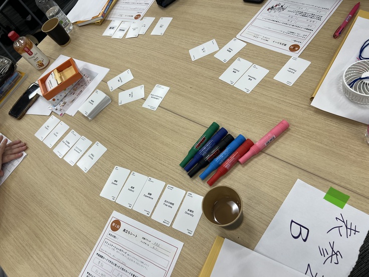 お昼休憩を挟み、午後はグループ替えをした後、価値観カードを使ったワークをしました。色々なキーワードが書かれたカードの内、何を手元に残し何を手放すかを決めつつ、自分の選択についてグループでシェアします。