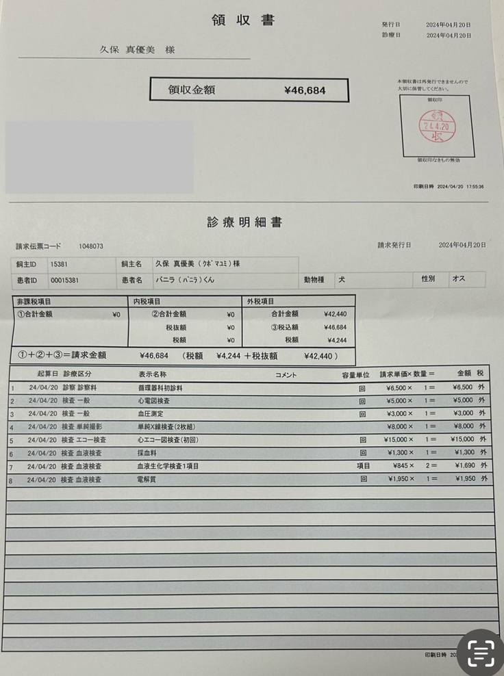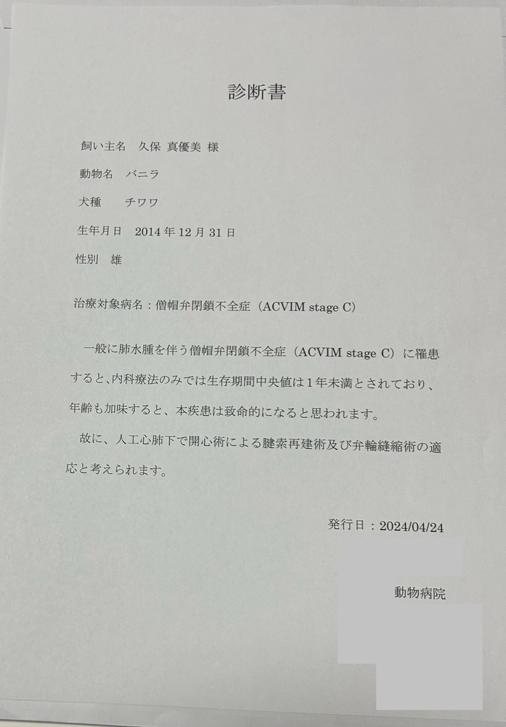 愛犬バニラの僧帽弁閉鎖不全症の手術、入院費、通院費のためにご支援いただいた資金を使わせていただきます。