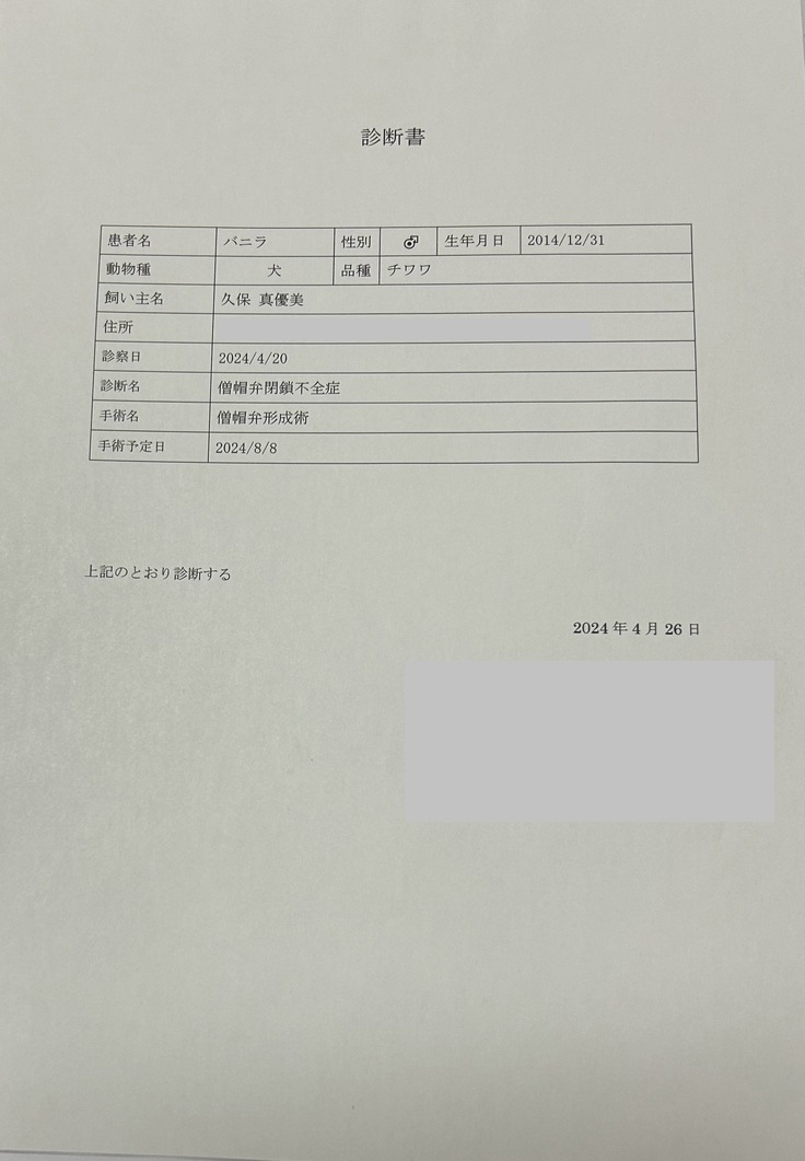 以下バニラが僧帽弁閉鎖不全症と診断された