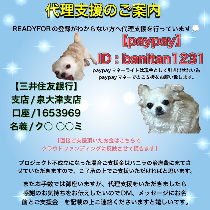 もしプロジェクトが不成立になった場合でもいただいた支援金は返金せずバニラの治療費に充てさせていただきますのでご了承の上でご支援いただければと思いますので何卒宜しくお願い致します。