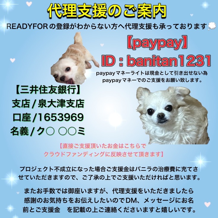 自身でローンを組めず高額な目標設定になっているため目標達成はかなり厳しい状況かと思います。しかし大事な家族であるバニラを病気から救ってあげたいのです。