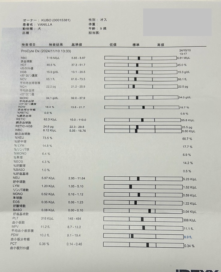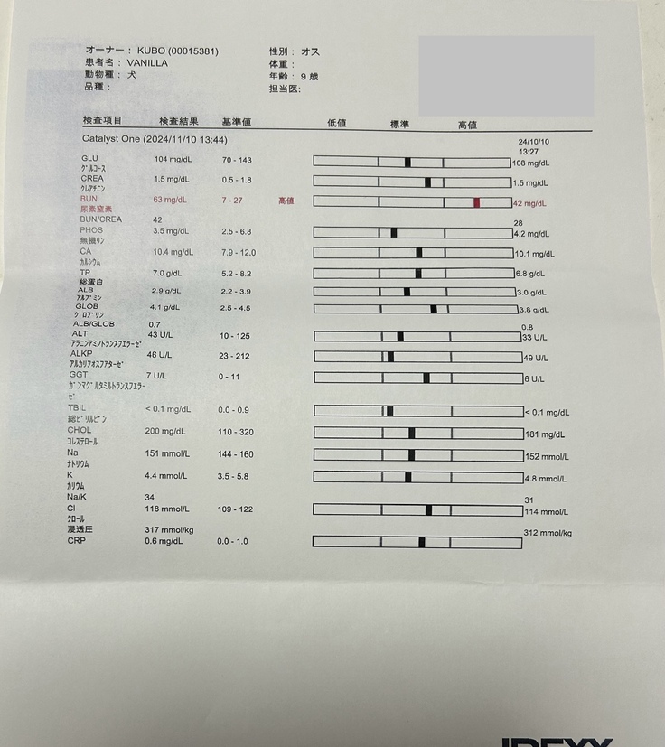 腎臓の方は尿素窒素が前回より上がってしまいましたがクレアチニンは前回と同じでした。