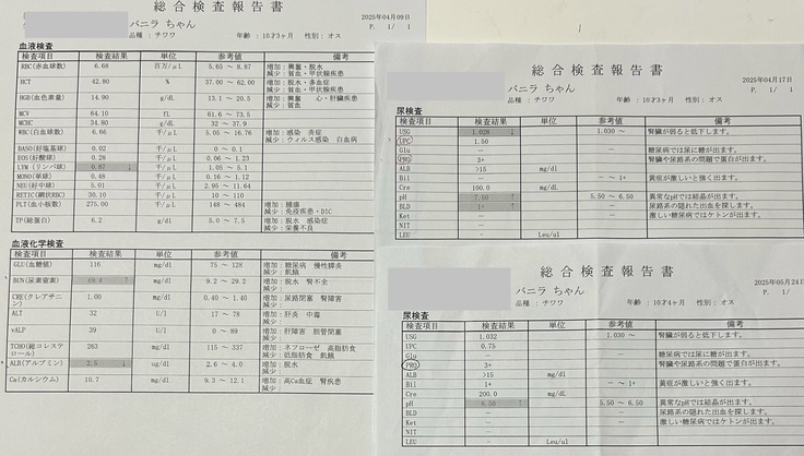しかしバニラは病院へ着くとずっと震えていて診察台に上がると更に震えてしまい…先生曰くこの状態なら上がっていても普通はもっと低いと思うので薬は変更なしで大丈夫との事でした。毎年フィラリアと狂犬病ワクチン接種のため健康診断をします。その際、腎臓数値は相変わらずで高めなのとアルブミンが低いので原因究明のため尿検査を行う事になりました。自宅で採尿し4/17に尿検査をしてもらいました。たんぱく尿があり外注に出されその後5/2より