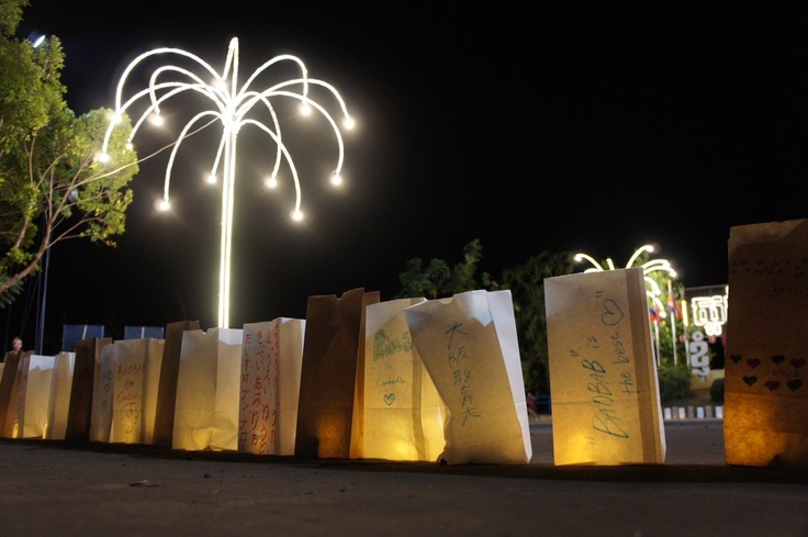 現地の子供たちに協力してもらい、一緒に作り上げました!紙袋に自由に絵や文字を書き、最後に紙袋の中にLEDランタンを入れたものを会場に飾りました。一人一人の様々な想いも込められ、とても素敵な作品でした!