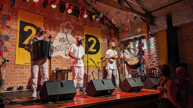 20:30オープンで、ライブは22:00から。このあたりからもう私が普段日本で親しんでいた音楽事情とは違います。22:00から2時間たっぷり、お客さんを踊り狂わせてましたのはDois dobradoの四人組。